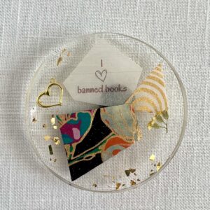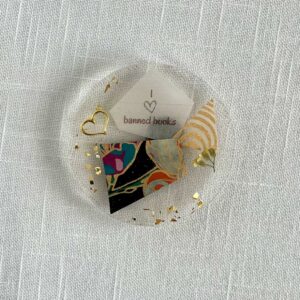 This decoration is a handmade collage encased in clear resin with a beveled edge. It is a one-of-a-kind item.
